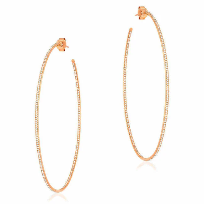 65mm solid 14k gold in and out hoop earrings with 412 natural, hand-set diamonds. A classic perfected, each hand-set micropave diamond adds shine to these showstopping large, slender hoops. Featuring friction post backings with comfortable butterfly closures.