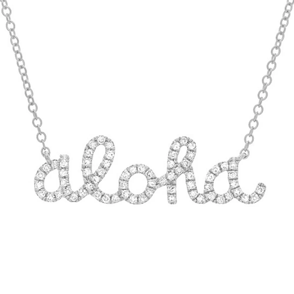 āAlohaā is a way of life! Apart from hello and goodbye, it means love, compassion, kindness, and grace. What better way to bring the spirit of Aloha home with you than your very own Aloha necklace? This instant favorite is handcrafted in 14k gold, hand-detailed and accented with pave diamonds. Layer it with your favorite Aloha collection necklaces. Itās available in a regular and mini size necklace, so you can customize your look.