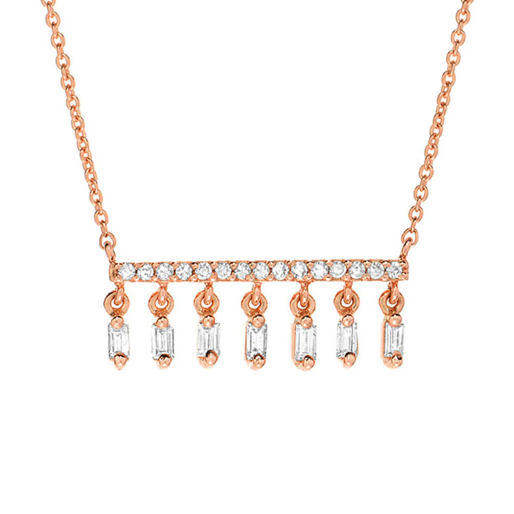In solid 14k gold and all-natural diamonds, this necklace features a bar of round diamonds, trimmed with 7 dangling baguette diamonds, on an adjustable 16-18" chain. Part of our Heirloom Collection, this charming twist on a classic bar necklace uses tiny handcrafted jump rings to create movement, allowing this necklace to add movement and shine to any neckline.