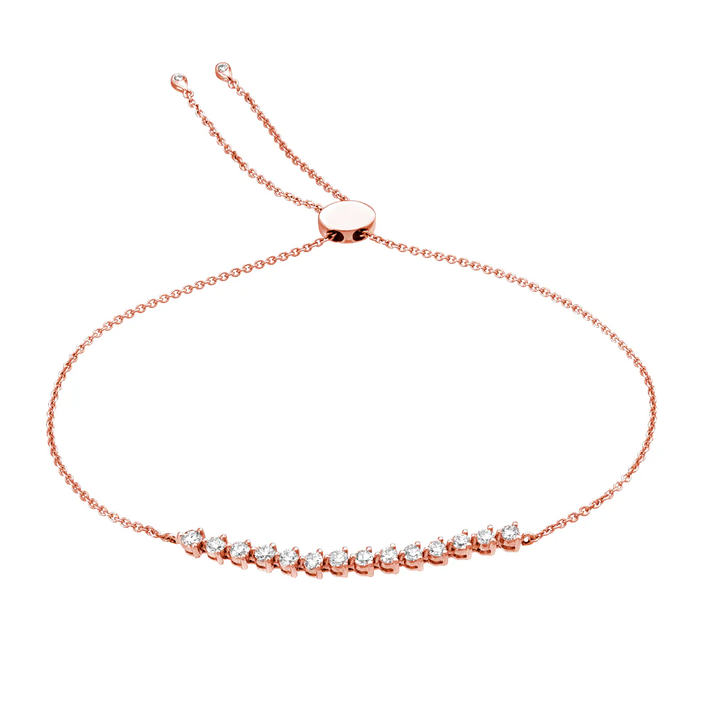 This luxurious diamond bracelet features martini set diamonds elegantly linked into a flexible tennis-bracelet style. This bracelet is finished with our sliding bolo clasp, allowing it to be worn at the length just right for you. Each chain is finished with a tiny diamond and gold droplet at the tip.Ā Handmade in solid 14k gold and all-natural, conflict free diamonds.
