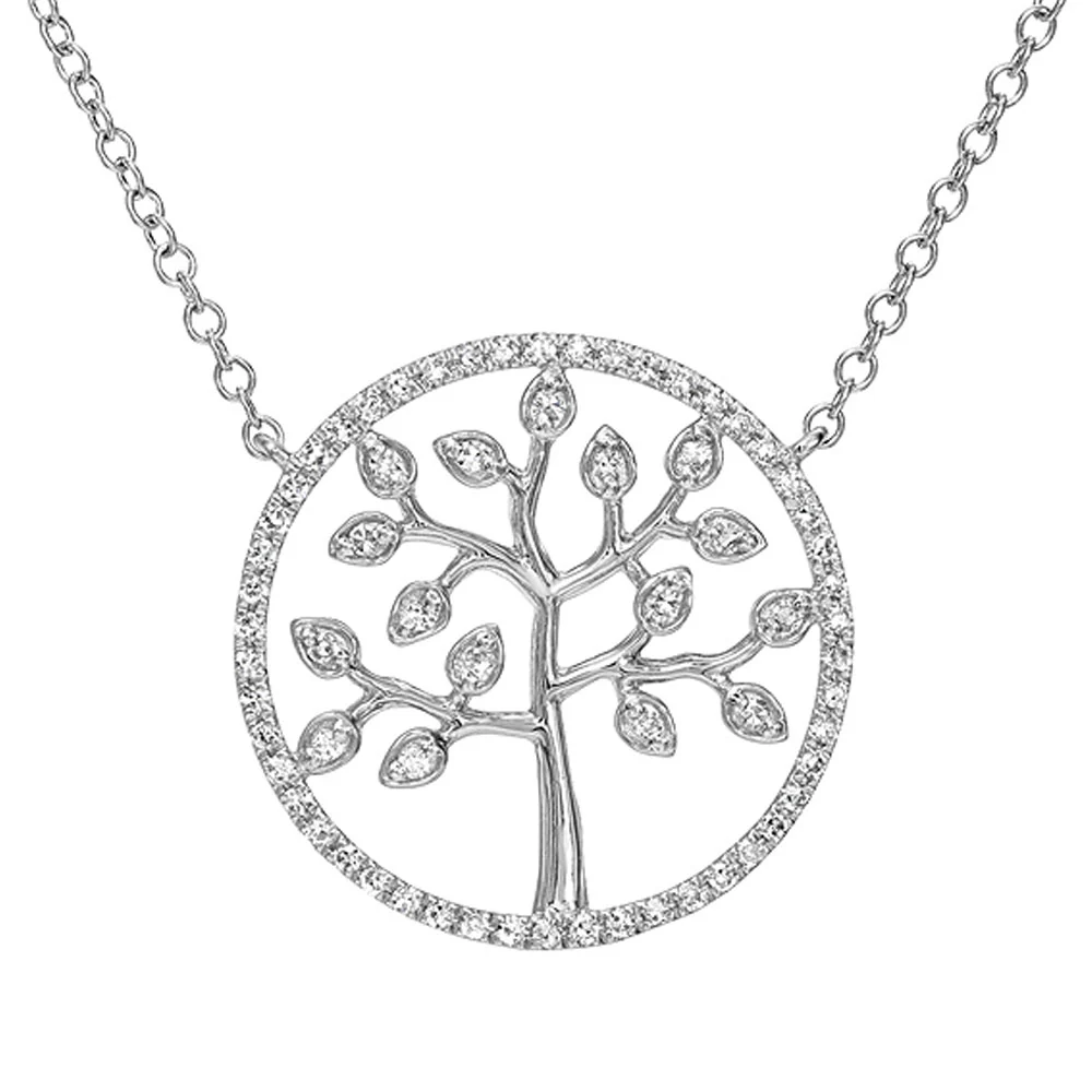 The tree of life is a timeless symbol of interconnectedness, fertility and immortality. A powerful talisman, this beautiful necklace features diamond-set leaves encased in a micropave diamond circle, hung from an adjustable 16-18" chain.Ā Handmade in solid 14k gold and all-natural, conflict free diamonds.