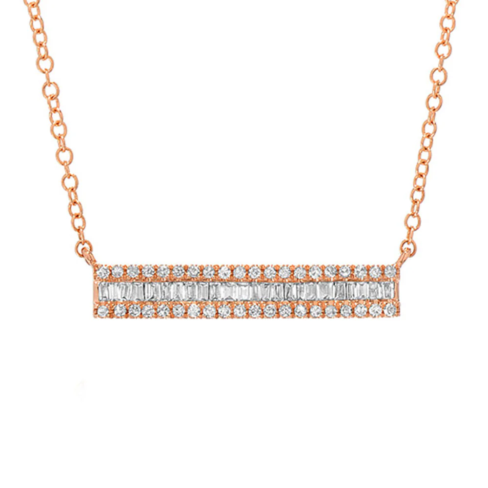 Part of our Heirloom Collection, handcrafted in solid 14k gold and natural diamonds, this 16-18" adjustable necklace features channel set baguette diamonds framed by two rows of diamonds. This signature motif is an up-to-date twist on a classic bar necklace, and the combination of gleaming gold, elegant baguette diamonds and sweet micropave will make this an everyday go-to necklace.