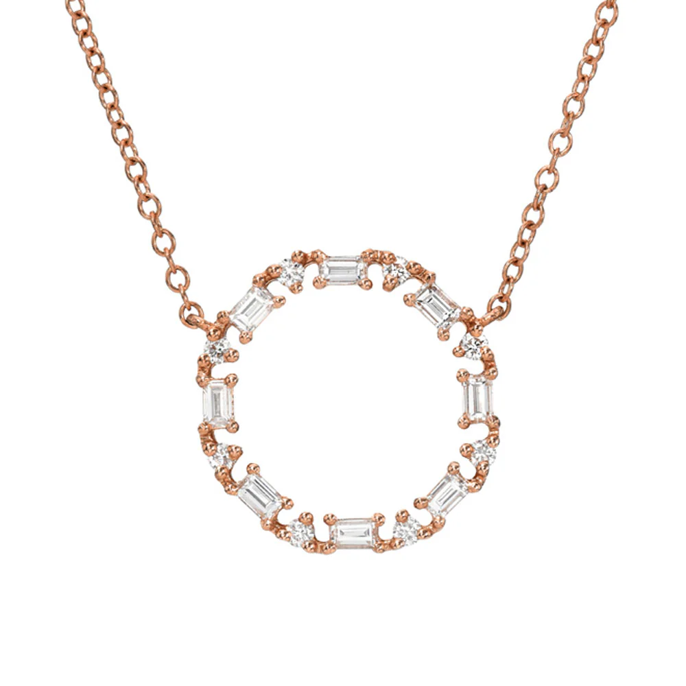 A part of our Heirloom Collection, this gorgeous circle necklace features natural round and baguette diamonds in a timeless, endless pattern, set in solid 14k gold.