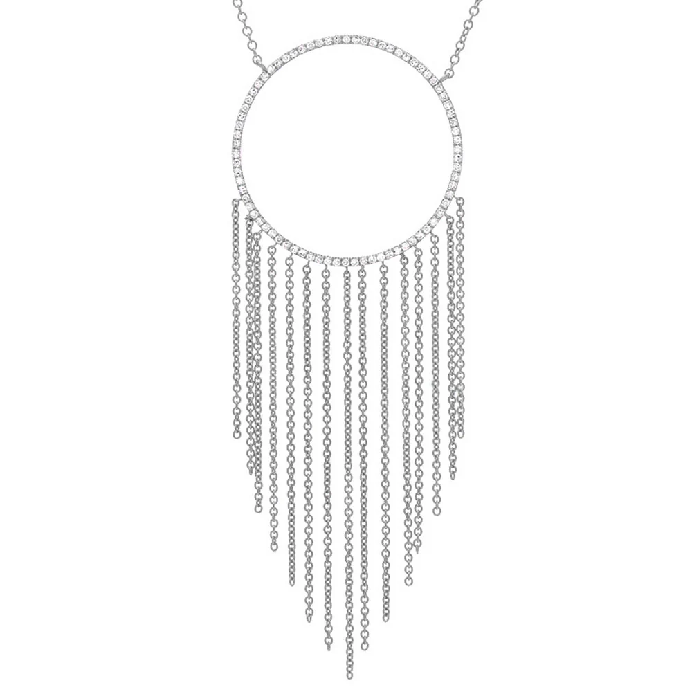 This solid 14k gold necklace features a striking open circle with natural diamonds and elegant chain fringe, set on a 22-24-26" adjustable chain.