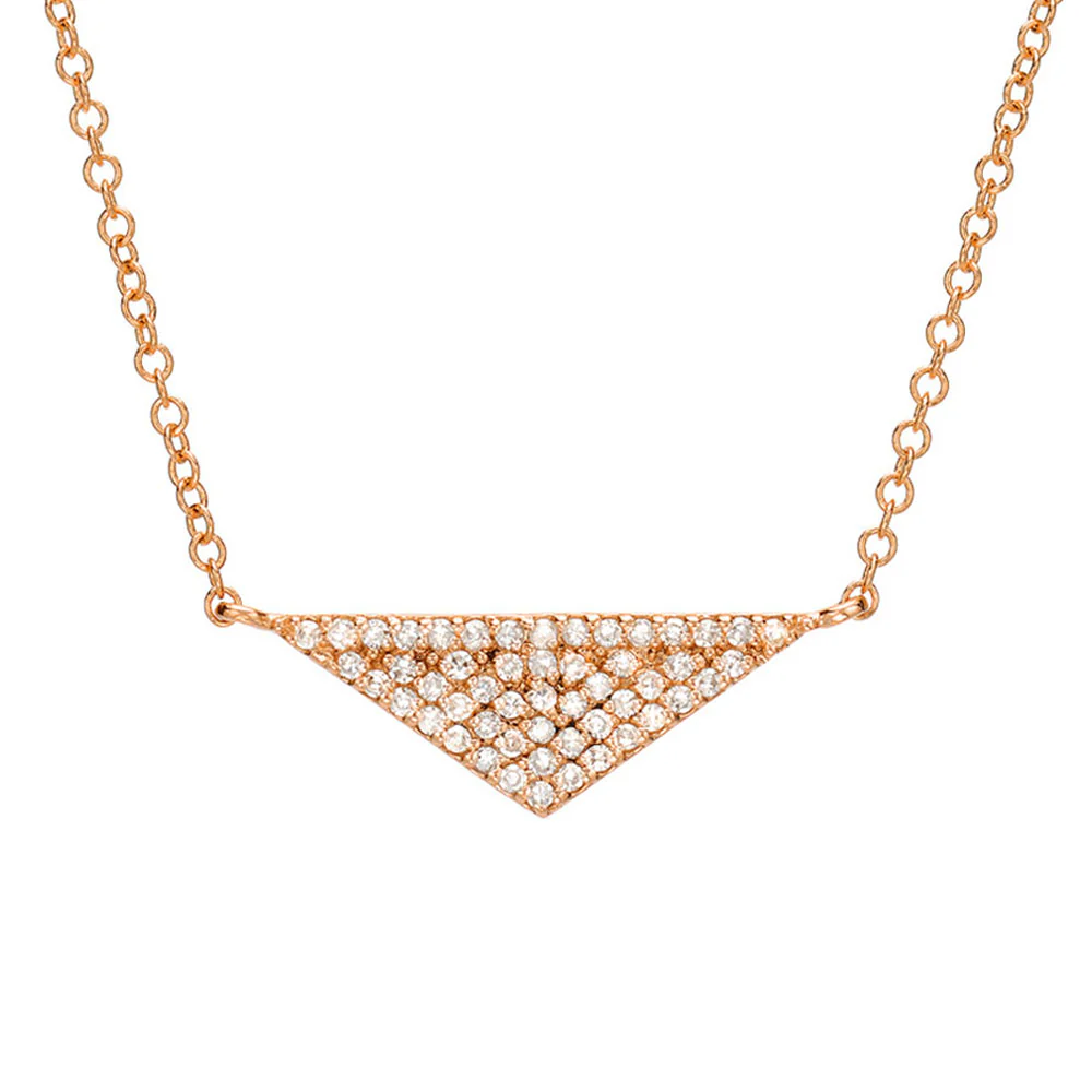Classic with an edge, the triangle necklace is set in solid 14k rose, white or yellow gold, hangs from a 16-18" adjustable chain, and features hand set, responsibly sourced natural diamonds. The approximate dimensions of the triangle are 16.3mm x 6.2mm.