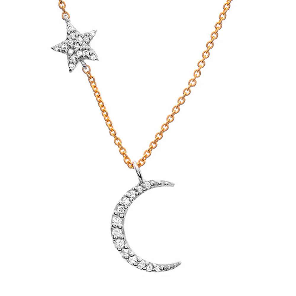 Is there anything more romantic than wearing the moon and the stars? This dazzling statement necklace accomplishes this feat with its moon and star motif and shimmering diamonds. The perfect gift for yourself or someone you love, our 14k solid gold mini moon and star diamond necklace brings the celestial wonder of the universe to any neckline. It gleams and sparkles with each movement, featuring 29 natural, conflict-free diamonds on a 16-18" adjustable chain.