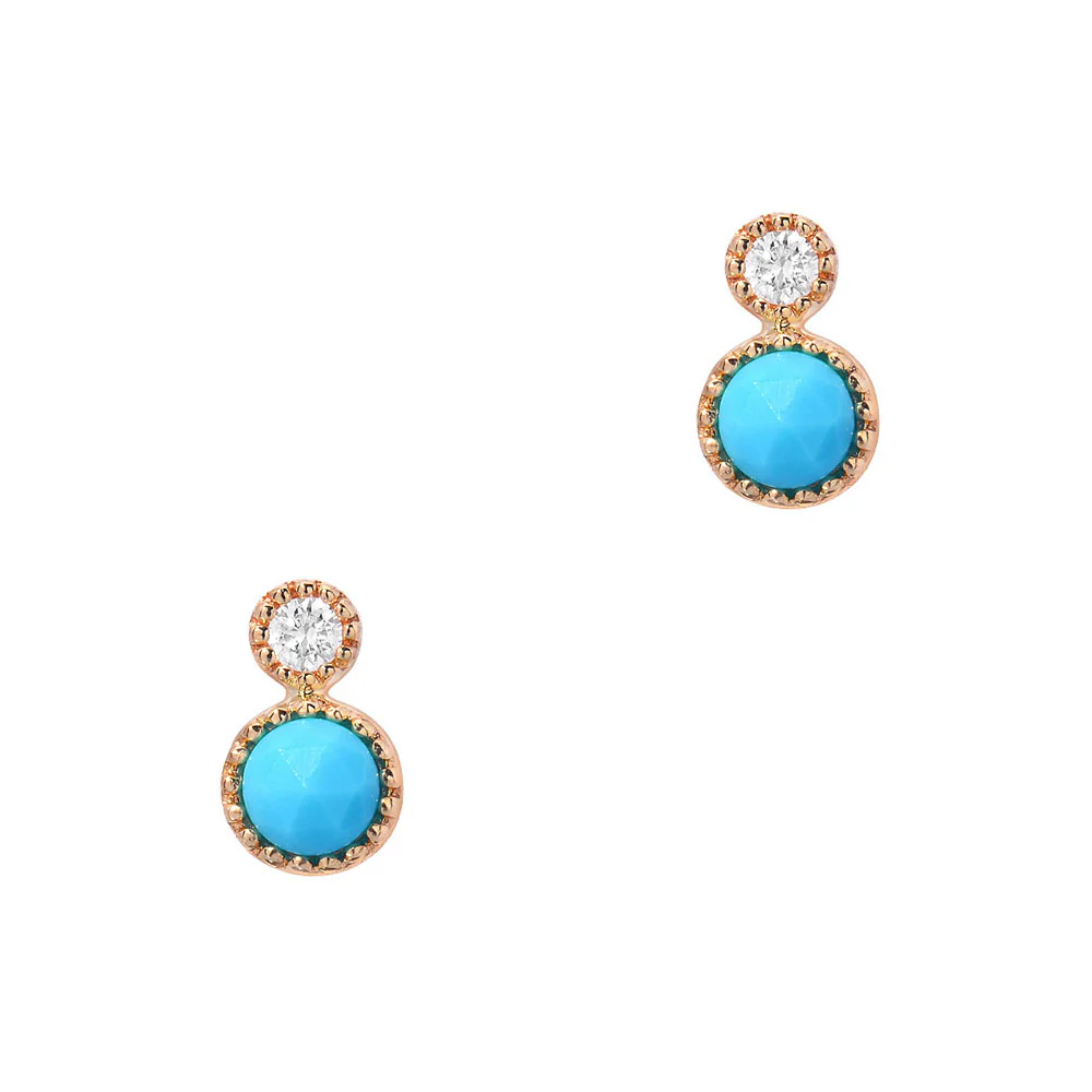 These adorable earrings feature a 3mm diameter rose cut turquoise accented with a petite bezel set natural diamond in 14k gold. Perfect for adding a pop of color to your everyday!