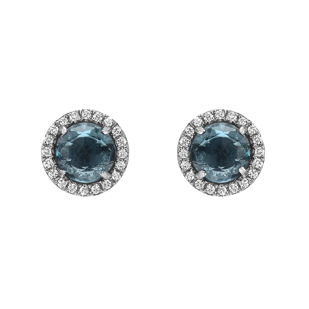 5.0mm stud earrings in solid 14k gold with a rose cut London blue topaz center and a halo of natural, conflict-free diamonds on each stud.