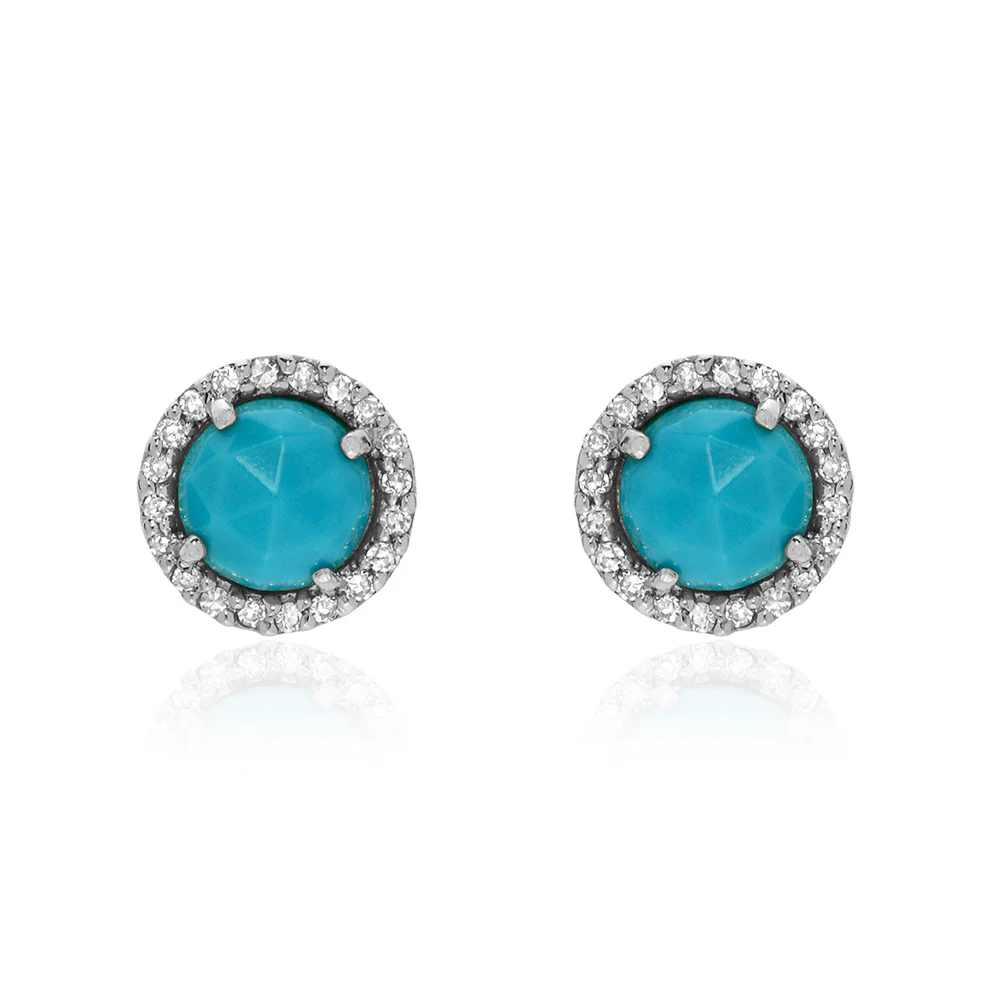 5.0mm stud earrings in solid 14k gold with a rose cut turquoise center and a halo of natural diamonds on each stud.