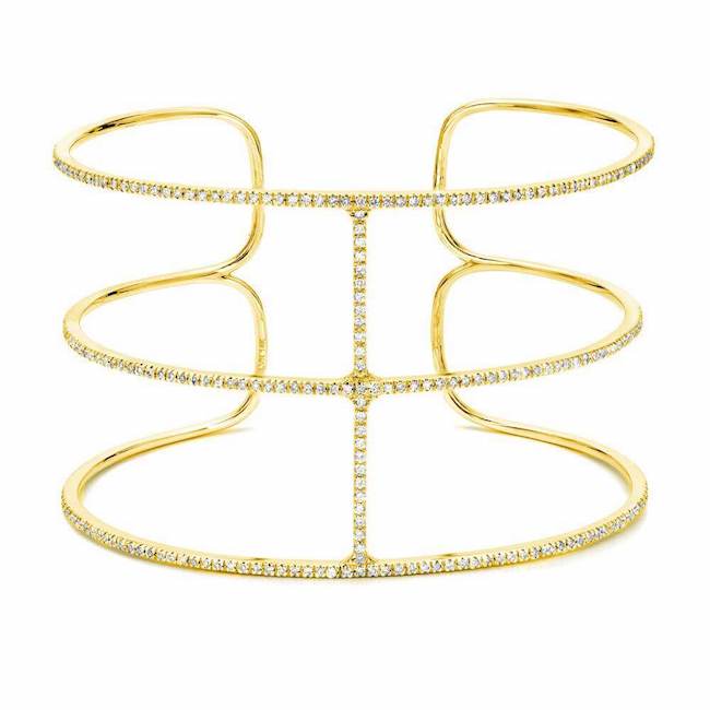 Beautiful 14k gold three-row cuff with hand set natural diamonds. Dainty yet striking, this is a wonderful statement piece.
