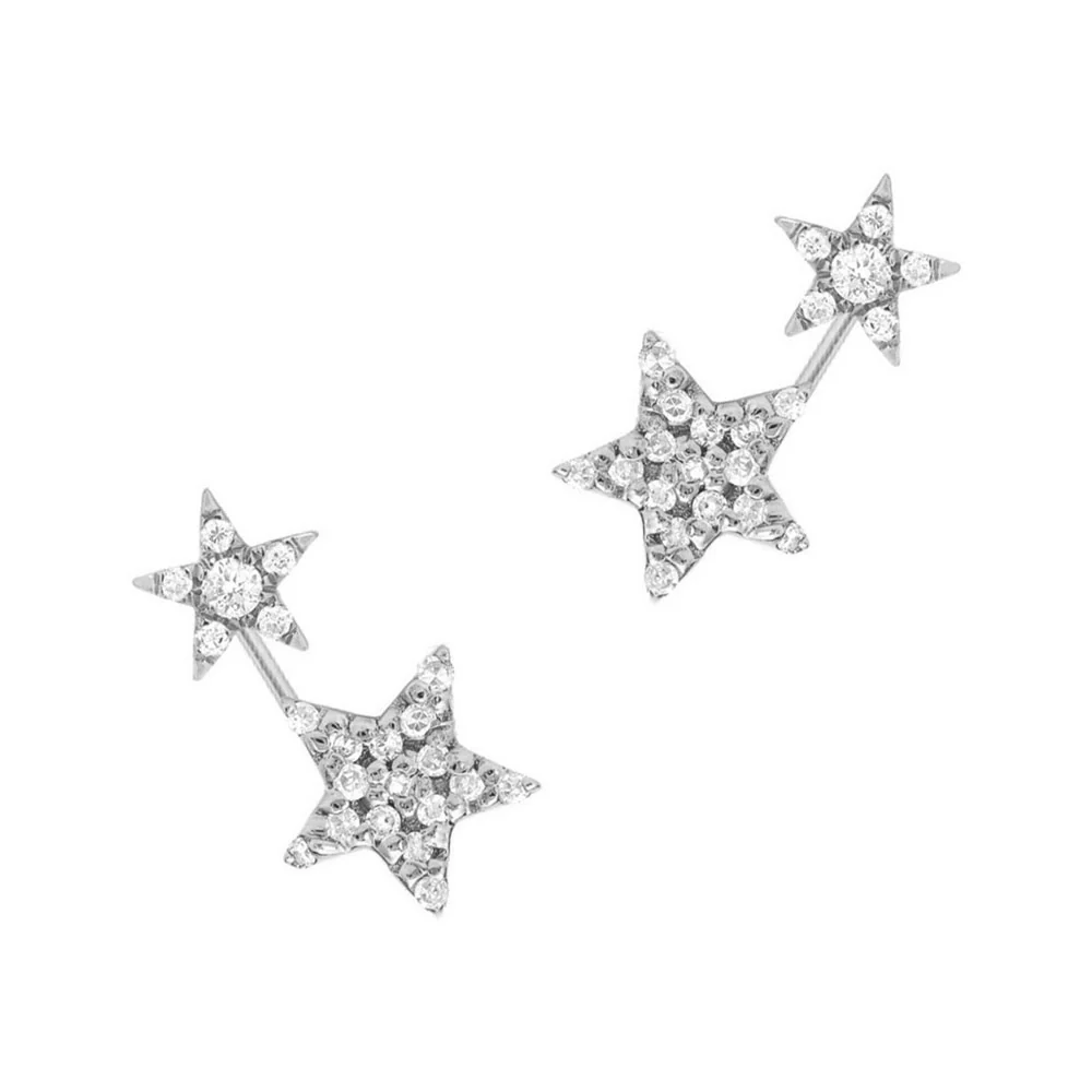 These shooting star earrings are a really fun way to add dimension to your ear. Each pair features ethically-sourced natural micropave diamonds set in 14k rose, white or yellow gold. Approximate total length of earring: 12.3mm. The stud is positioned in the center of the larger star, so the earring can be worn in a variety of different directions, like a climber.