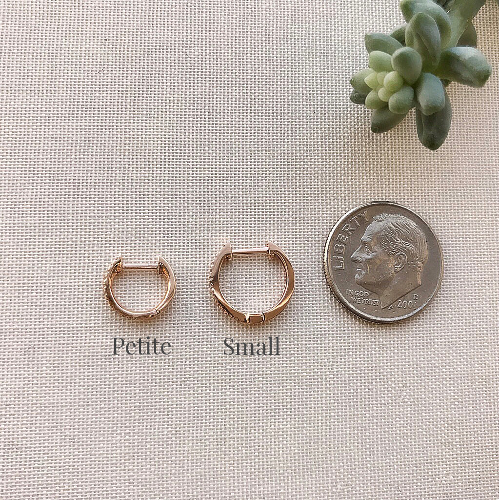 Looking for something a little simpler? Try our High Polish Huggies. For second and third holes, try our Petite Diamond HuggiesĀ or Petite High Polish Huggies. Or for something a little bigger, try our 12mm Huggies in diamond or high polish finish, or our 15mm Huggies in diamond or high polish finish.Ā Ā Looking for some guidance?Ā Click here to read our comprehensive guideĀ to find the right huggies for you.