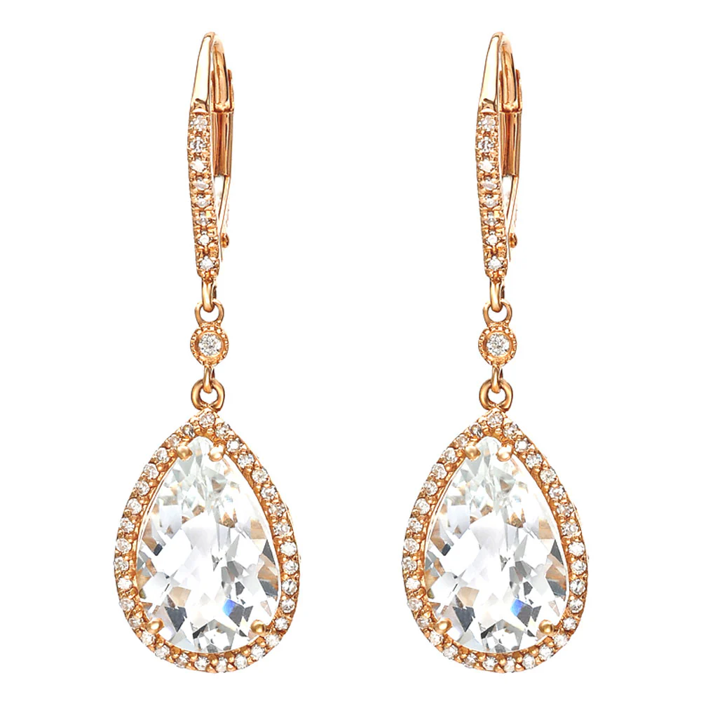 These stunning 14k gold earrings feature two beautifully faceted white topaz stones lined with natural diamonds and accented with two bezel set diamonds.Ā A true dream for a traditional bridal jewelry look, with enough versatility for any occasion, these classic drop earrings are simply stunning.