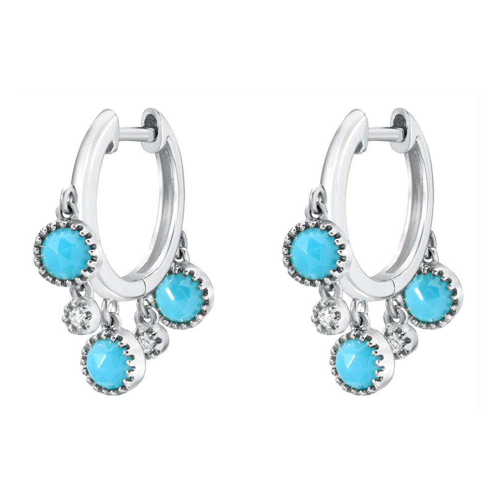 These comfortable high polish huggies take it to the next level with a fun fringe of bezel set alternating petite natural diamonds and 3mm diameter turquoises. Attaching the bezels with subtle jump rings adds movement to these extra-special earrings.Ā
