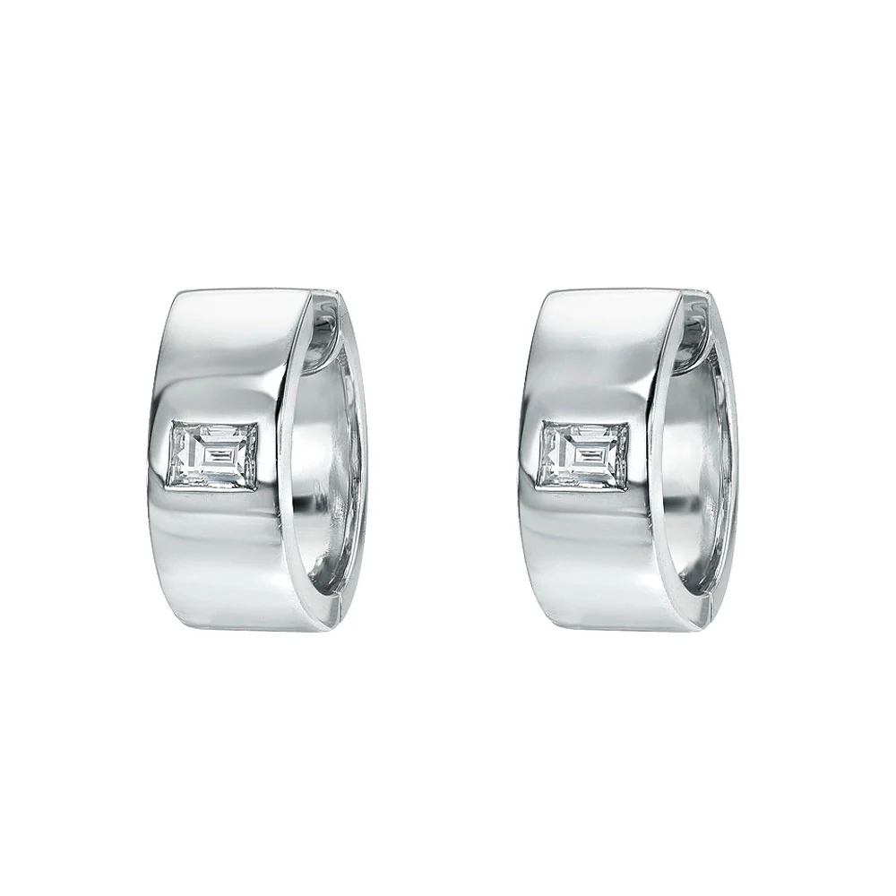 These beautifully simple huggies feature a wide, flat face and a diameter ideal for everyday wear. Each pair is hand-crafted in high polish 14k gold with a beautiful baguette diamond embedded in each.