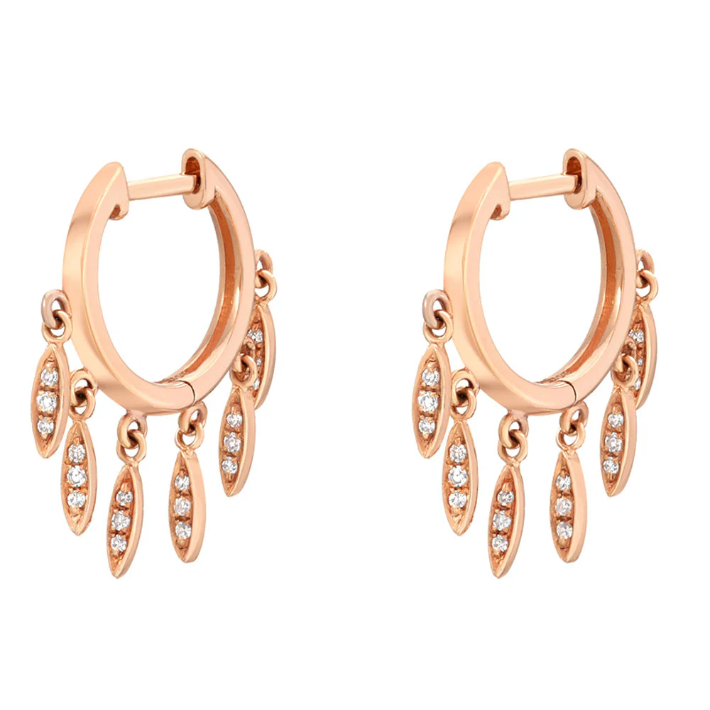These comfortable high polish solid 14k goldĀ huggies take it to the next level with a dramatic fringe of our signature dainty willow leaves, set with natural diamonds. Attaching the leaves with subtle jump rings add movement to these extra-special earrings.Ā